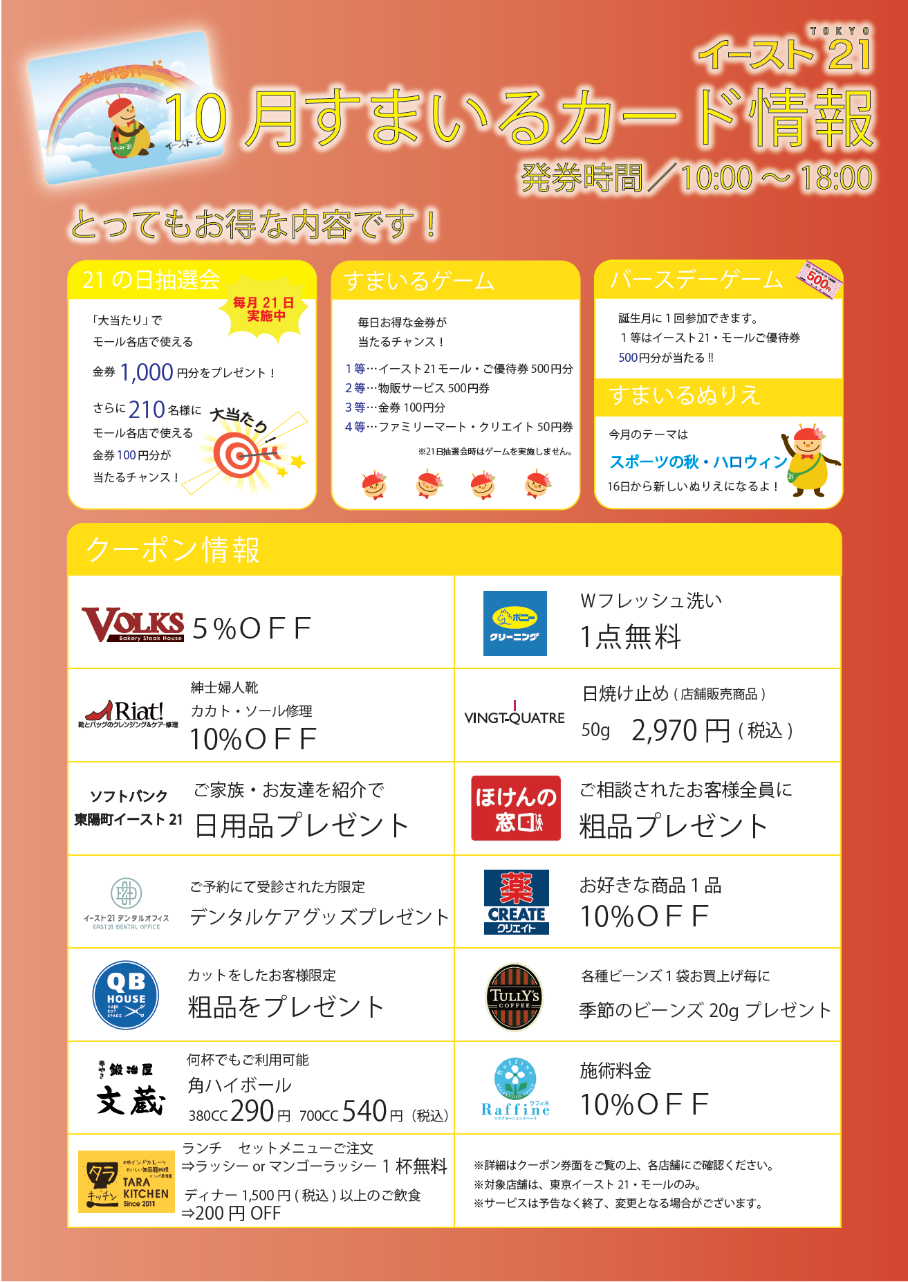 毎月21日にイースト21・モールの飲食店をご利用いただくと、金額2,000円毎に500円のご優待券がクーポンバックされます。(レシート金額合算可 ※金額上限30,000円まで)